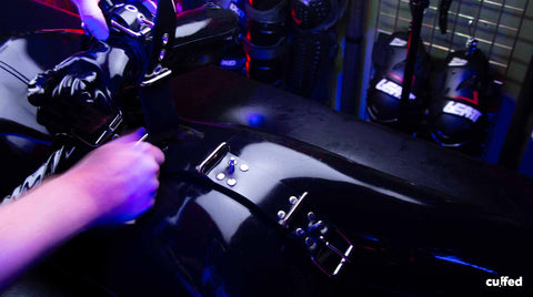 1. Place your sub comfortable on his/her belly. Fix the wrist restraints on your sub. Make that for each wrist restraints one d-ring is positioned on the lower side of the arm.