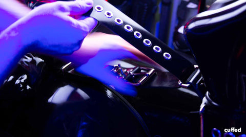 2. Position your sub’s arms horizontally behind his back. Attach the back belt to the open d-rings of the wrist restraints. Check the servant position for the details. The end of the back belt with the buckle should point to the legs.